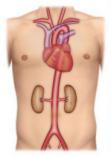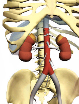 Around the abdomen, the aorta splits into the 2 common iliac arteries (bifurcation), right and left, one for each leg.