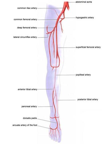 The iliac arteries then branch out as femoral arteries at the groin and the thigh and then become the popliteal artery at the knee.