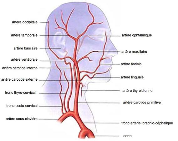 - carotide primitive droite et gauche se divisant au cou en carotide externe et carotide interne