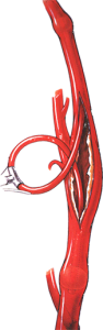 The artery is then closed by a suture either direct or with a patch (piece of prosthesis sewn to the artery so as to increase its diameter)